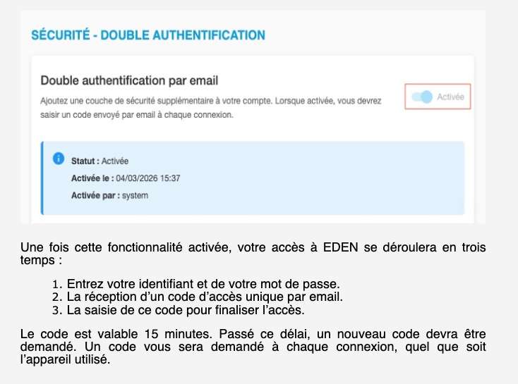 Infos importante EDEN sur la double authetification , je vous conseille d’activer la possibilité, mais aussi et surtout de mettre un mot de pass complexe pour l’acces à votre compte mais aussi à votre boite mail.